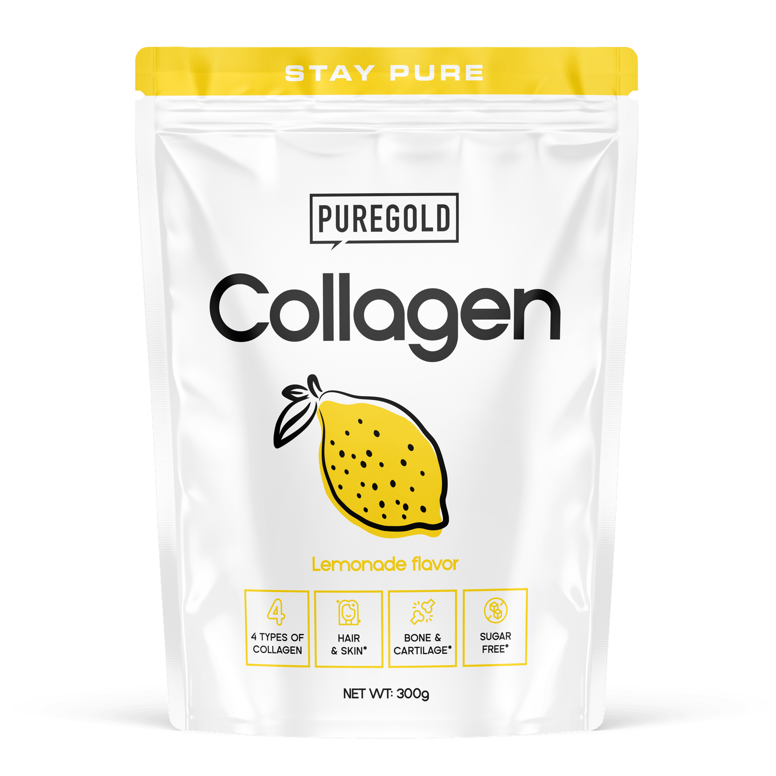 Collagen RinderkollagenpulverPure Gold Collagen ist ein Getränkepulver aus hydrolysiertem Rinderkollagen mit Zusatz von Vitaminen, Zink, Selen und Süßungsmitteln.